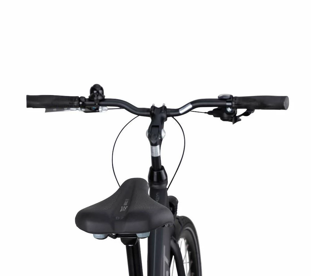 Sittställningen är upprätt, styret är lätt vinklat för bästa ergonomi och i ändarna sitter sköna handtag monterade. Styrstammen är justerbar så du enkelt kan ställa in en position som du trivs bäst med. Sadeln är bred med god komfort – precis som vad hela cykeln står för – komfort, kompetent och pålitlig.