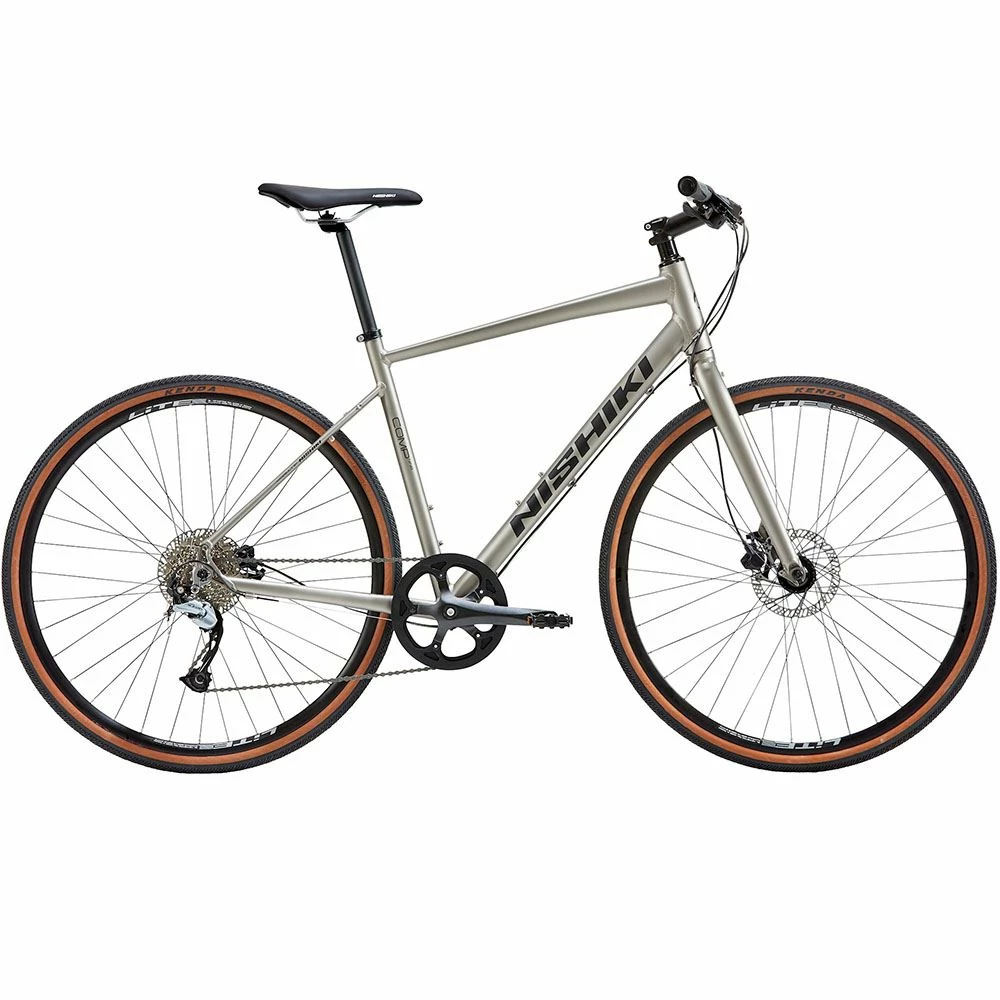 Nishiki Comp Nine är en racehybrid med kvick geometri och en körställning som inbjuder till snabb och lekfull körning. Cykeln har en stomme med Nishikis egenutvecklade ram med god balans mellan komfort och prestanda. Ramrör och gaffel är tillverkade i aluminium vilket gör att vikten hålls nere. Comp har en singelklinga fram och 9 växlar bak.