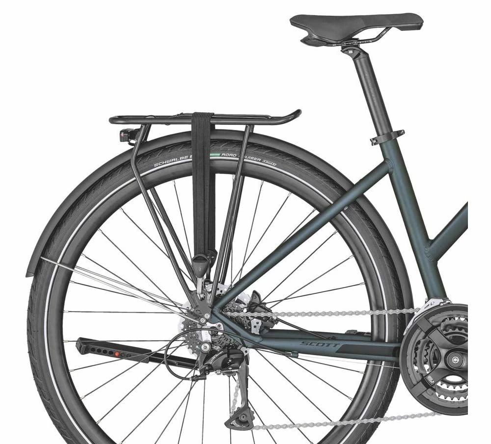 Cykeln kommer färdigutrustad med stänkskärmar, stöd, lampor och en pakethållare från Racktime. Pakethållaren är fullt kompatibel med Racktimes Snap’it tillbehör vilket gör det lättare än någonsin att på ett smidigt sätt få med sig det du vill ha på cykeln.