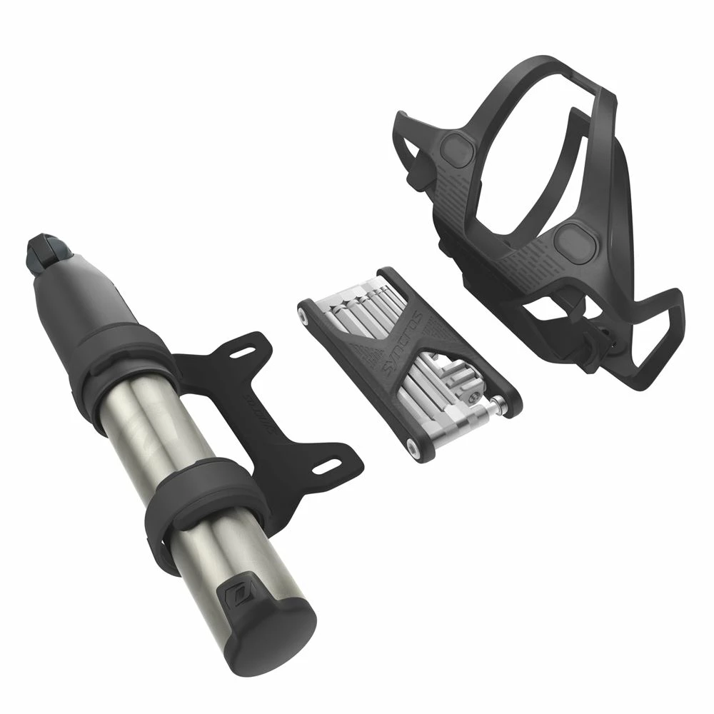 Syncros Tailor IS 2.0HV Bottle Cage är ett smart kit med flaskhållare med integrerat multiverktyg och MTB-pump. Syncros har designat en smart konstruktion som gör att den passar smala ramutrymmen. Den kan monteras både till vänster och höger. Multiverktyget har hela 19 funktioner och ett integrerat kedjeverktyg. MTB-pumpen är Syncros kvalitativa Boundary 2.0 High Volume. Trots att kitet har många funktioner kommer det i lätt vikt och är hela 41 gram lättare än Matchbox Tailor Cage.
